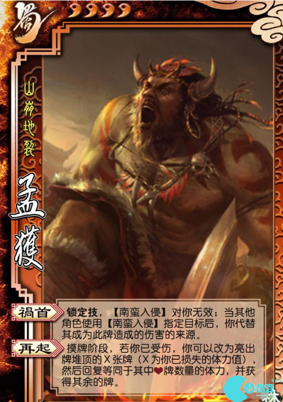 5血,最多能“再起”过4牌,有不错的回复能力,但也仅此而已。反贼一般会选择放养孟获,先杀忠臣。