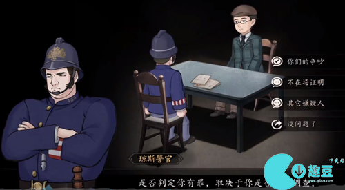4、后面剧情就是到审问阶段,到达审问阶段了之后这个选项我们需要选择"不在场证明"。