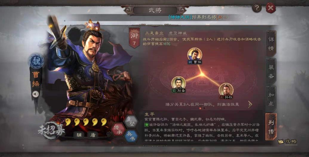 在战术补充方面,考虑到曹操已经是一个比较全能的角色,我们需要的是能在他的基础上,进一步补齐战力短板的将领。例如: