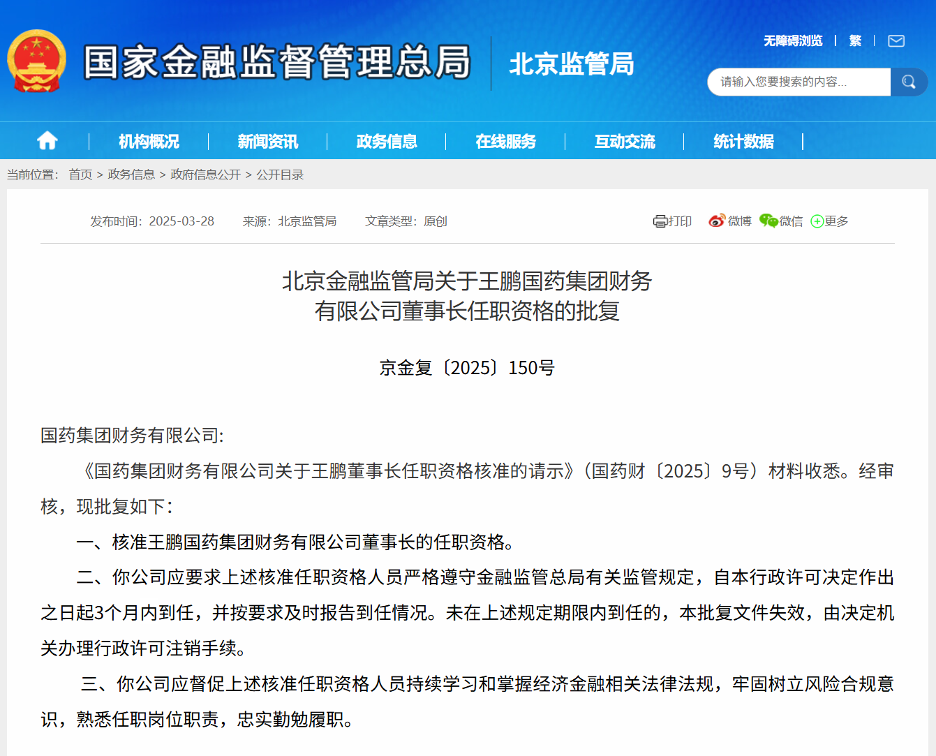 王鹏获批担任国药集团财务公司董事长 更新时间:2025-03-31 15:21:28 •阅读 0 财经3月31日讯 日前,北京金融监管局公布相关批复信息,核准王鹏国药集团财务有限公司(简称“国药集团财务公司”董事长的任职资格。以下是相关批复正文: