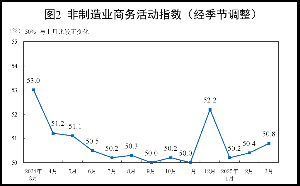 3月份,非制造业商务活动指数为50.8%,比上月上升0.4个百分点,非制造业扩张步伐有所加快。