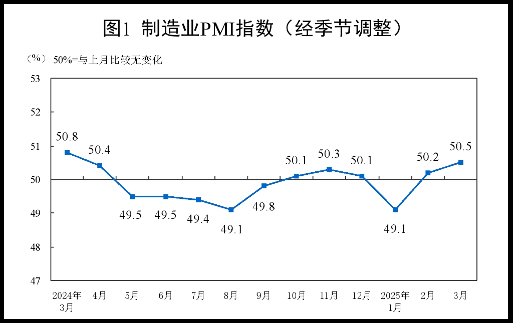国家统计局服务业调查中心、中国物流与采购联合会3月31日发布数据显示,3月份,企业生产经营活动加快,制造业采购经理指数(PMI、非制造业商务活动指数和综合PMI产出指数分别为50.5%、50.8%和51.4%,比上月上升0.3、0.4和0.3个百分点。