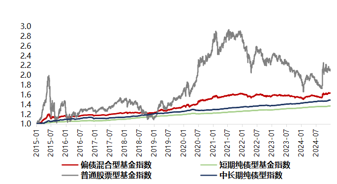 数据来源:wind。统计2015-1-1至2024-12-31,业绩取偏债混合型基金指数(885003.WI、短期纯债型基金指数(885062.WI、中长期纯债型基金指数(885062.WI、普通股票型基金指数(885000.WI。历史业绩不代表未来表现,详细注释见文末。