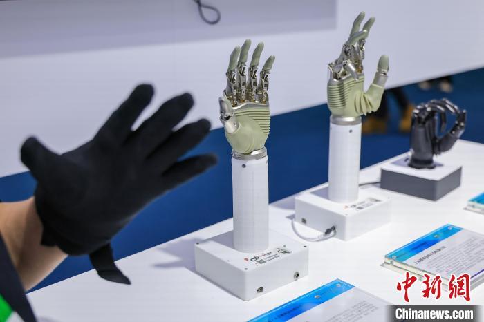 4月13日,海南海口,参展人员展示一款智能仿生手。中新社记者 骆云飞 摄