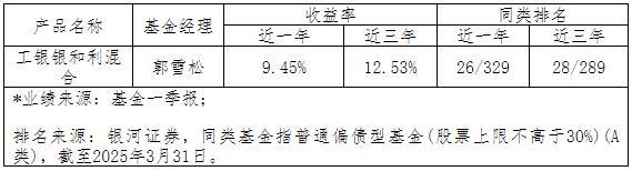 5、工银银和利混合成立于2016年12月29日。郭雪松自2020年6月11日至今担任本基金基金经理。该基金2020年-2024年各年度、近一年净值增长率分别为19.32%、16.78%、-7.03%、-0.94%、11.95%、9.45%,同期业绩比较基准为10.33%、2.25%、-4.5%、-0.17%、10.21%、6.84%。数据来源于基金定期报告,各年度数据来源于各年度年报,近一年数据截至2025年3月31日。