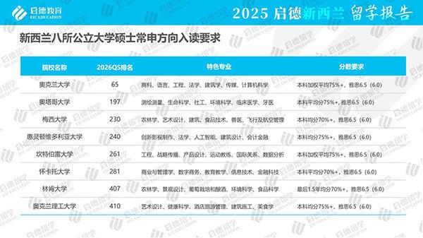 新西兰授课型硕士学制一般为1至2年,雅思要求6.5分且单项不低于6分;部分商科、护理、教师和计算机相关专业接受跨专业申请。部分院校也提供专升硕路径,大专毕业生可通过一年的硕士预科课程升读硕士。新西兰八大普遍要求GPA70%-75%,顶尖院校如奥克兰大学建议GPA75%-82%以上;热门专业择校方面,商科和计算机可优先考虑奥克兰大学、惠灵顿维多利亚大学、及怀卡托大学,工程和环境类专业推荐坎特伯雷大学,农业及食品类则林肯大学和梅西大学更具优势。
