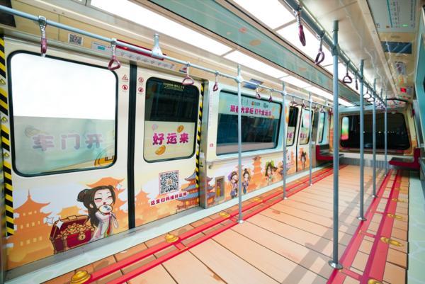 在古风车厢里,作为《叫我大掌柜》游戏的核心文化符号,汴梁风情被精心融入每一处细节。地板模拟宋代木栏板桥纹理,游戏中经典的掌柜形象与全运赛事图标相映成趣。车厢门上,广府醒狮、特色建筑屹立其中,搭配游戏内灵动的小玉角色插画,让乘客在乘车途中仿佛与游戏角色并肩。既展现了传统文化的韵味,又传递出积极向上的运动精神。