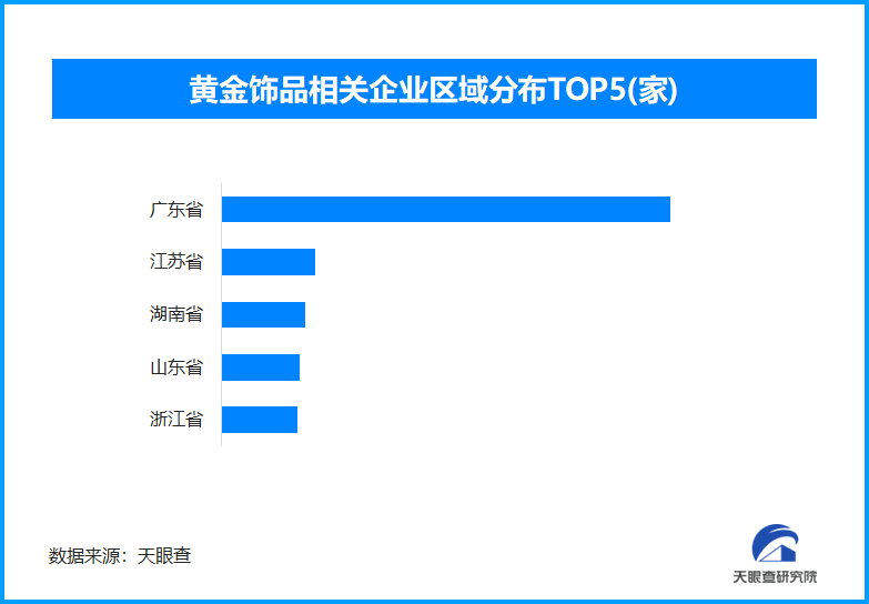 从区域分布来看,广东省黄金饰品相关企业数量位居首位,以超3.8万的相关企业数量,占全国总数的27%。排在其后的是江苏省、湖南省、山东省和浙江省。