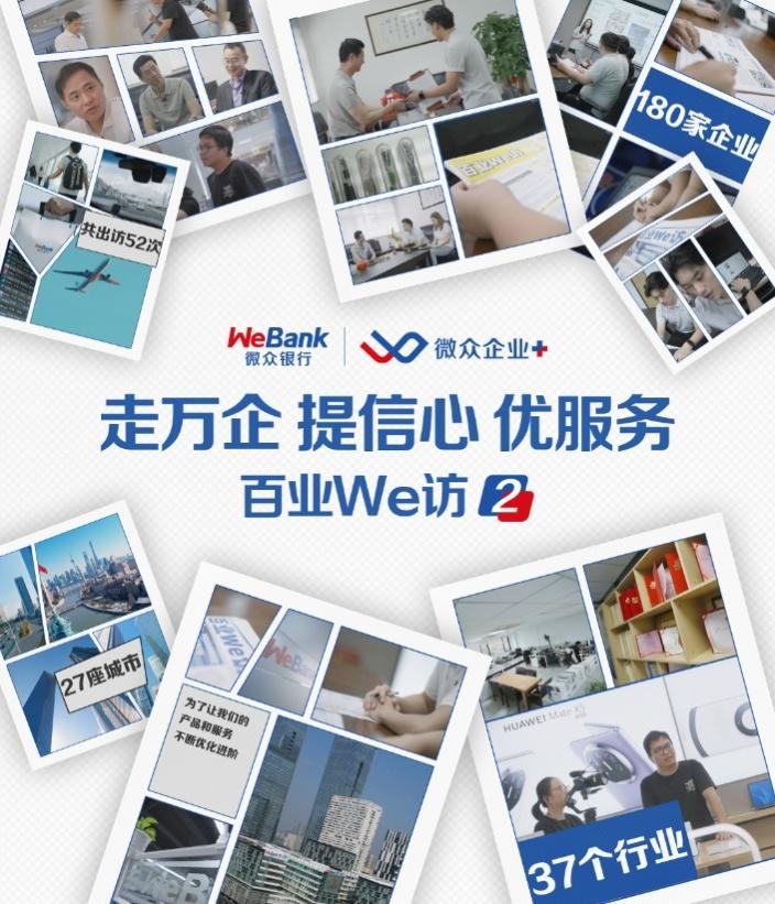 今年,微众企业 通过深入践行“走万企 提信心 优服务”活动要求,开启“百业We访”行动,以企业心声为指引,优化金融产品和服务流程,提升金融服务能力和中小微企业的满意度。截至目前,微众企业 已累计走访了27座城市、37个行业的180家企业,并已针对重点问题进行排查和优化。未来,微众银行将持续发挥数字科技之长,健全完善与客户的沟通机制,提供多元的权益服务体系,助力企业更好地解决经营难题,与中小微企业共同成长。