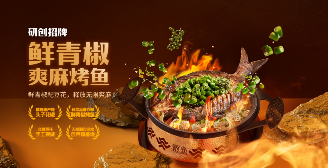 探鱼在品牌创立初期推出“重庆豆花烤鱼”作为招牌菜式进行差异化竞争。此外,品牌还根据消费者需求推出“鲜青椒爽麻烤鱼”,创下单品贡献超50%营业额的惊人纪录。十年间,探鱼不断调整和丰富门店产品品类,创新烤鱼味型、配菜和原料。截至2023年3月,探鱼产品库中仅主产品烤鱼已有超过120种口味,其他品类美食也有丰富研发成果。
