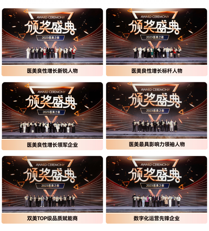 本届医美之夜颁奖盛典共颁发“医美良性增长新锐人物”、“医美良性增长标杆人物”、“医美良性增长领军企业”、“医美最具影响力领袖人物”、“双美TOP级品质赋能商”和“数字化运营先锋企业”六大奖项,汇集了行业极具影响力人物与机构,对2023年过去一年间,在医美行业发展中做出突出贡献的机构和个人进行表彰。此次盛典更是一次全行业的沟通交流盛会,努力推动国内医美行业发展新趋势。