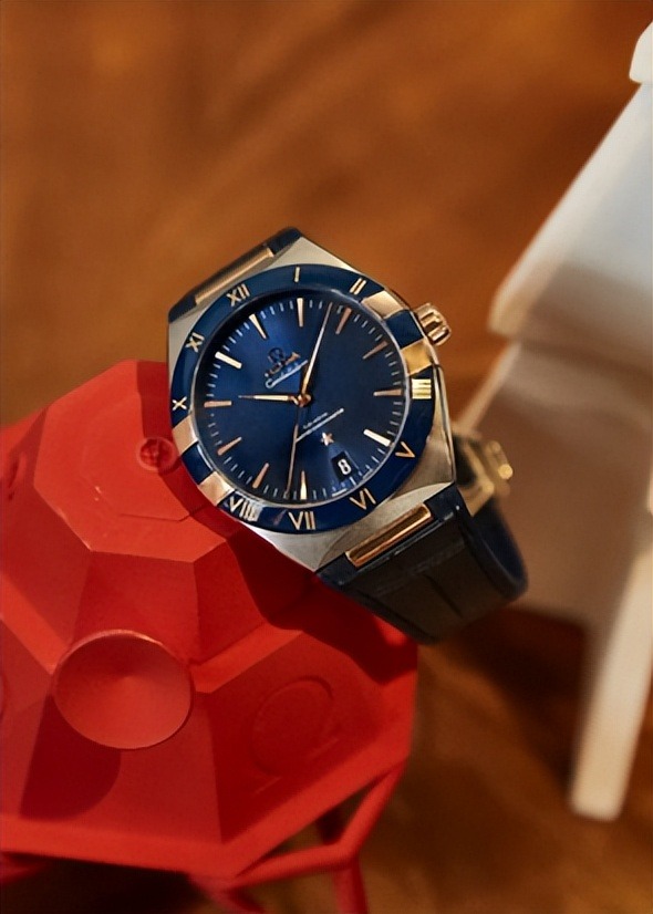 而这款星座系列 41 毫米男士手表虽同样采用 Sedna 18K 金与精钢打造,但风格醒目动感。表圈采用的是蓝色抛光陶瓷设计,沉稳温润,表圈上的罗马数字也是采用了OMEGA欧米茄 Ceragold技术制成,与手表整体设计统一和谐。