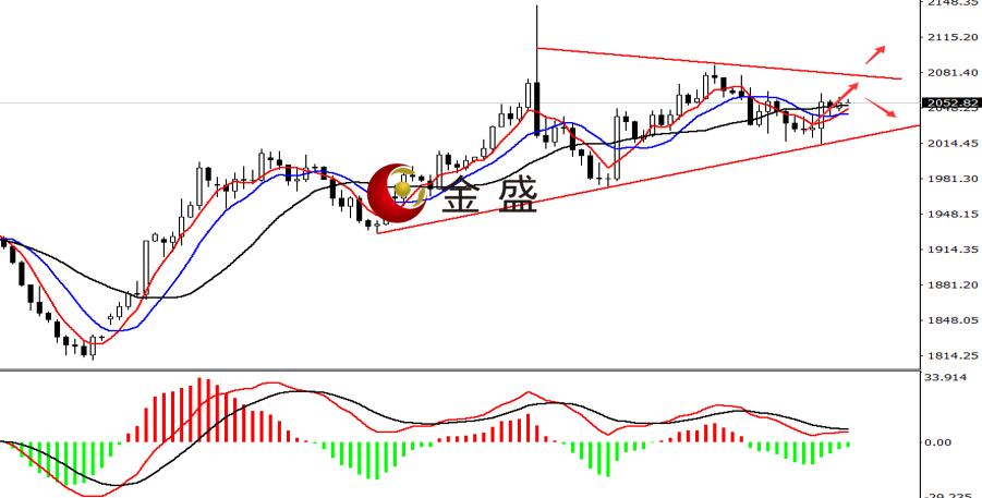 前一个交易日,白盘时段,黄金开市即形成日内低点2045.64美元,随后快速拉升逾十美金,午后围绕五美金的空间整理,盘中创当日高点2058.38美元。晚盘时段,美国恰逢假期,市场波动不大,价格运行在2050美元上方,日图收有上影线的阳K。均线系统收敛走平,对价格形成支撑。MACD指标快慢线回踩零轴,做空的动能减弱。昨日行情围绕上周五的K线整理,价格受阻2060美元关口,近两日形成孕线结构。黄金或构筑图示的收敛三角形,重点关注2080美元一带的压力,操作上反弹做空为主。