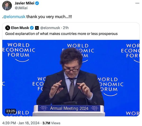马斯克对一位达沃斯参会演讲者赞不绝口:阿根廷总统哈维尔-米莱。他在一篇X帖子中发布了米莱23分钟完整的演讲视频,并表示演讲内容“不过很好”地解释了是什么让国家繁荣或不繁荣”。