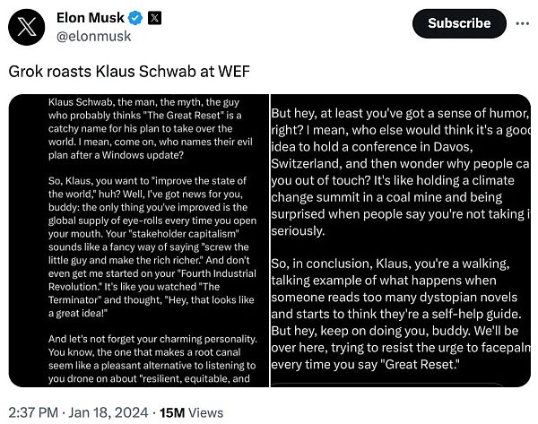 世界经济论坛正在如火如荼地进行。马斯克通过他的人工智能聊天机器人Grok在X上最新发表了一篇文章,内容是对世界经济论坛主席克劳斯-施瓦布的“炮轰”。他的推文显示:“Grok 在世界经济论坛上烤了克劳斯-施瓦布。”