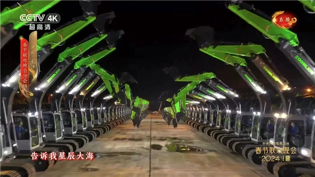 当春晚的镜头来到中联智慧产业城土方机械园,荧屏上顿时溢满了科技感和机械感:中联重科数十台泵车、起重机展臂傲立舞台后方两侧,两台泵车在30米的高空用臂架组成一个巨大爱心,两百多台挖掘机依次排开,数十台高空作业平台举臂林立,极为壮观;舞台上两台装载机随歌“伴舞”,一粉一绿活泼可爱。乐队贝斯手、吉他手的“站台”都是用的高空作业平台。在“小绿军团”众星拱月中,歌手黄米依从装载机中走出来,倾情演唱着《星辰大海》。大国重器壮观施工之美,中联智慧产业城土方机械园灯塔工厂制造之美,以及歌舞演唱之美尽情展现。满满的“长沙制造”元素,在荧屏上“龙”光焕发惊艳呈现。