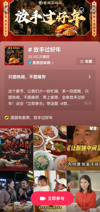 为进一步扩大传播效果,紫燕食品同步在抖音平台开启了全民微任务,邀请用户以#放手过好年&#我的新年搭子#话题发布视频或图集,在多位kol的创作引导下形成了持续引爆的传播态势。值得一提的是,短片的配音演员季冠霖曾为热门电视剧《甄嬛传》中的甄嬛配音,紫燕食品也巧妙借势这一经典IP,在抖音平台发起配音二次创作活动,以搞笑幽默的画风吸引大量网友参与,其中一些视频点赞量高达19w。截至目前,#放手过好年&#我的新年搭子#话题下的图文视频在抖音播放量已达25.9亿次,在层层递进的互动传播中,紫燕食品进一步强化了消费者对家庭佐餐好友品牌形象的认知,实现品牌传播目标。