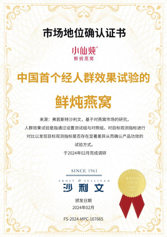 近期,小仙炖的研发团队与中国农业大学的院士团队合作,发布了阶段性科研成果。这次阶段性试验验证了燕窝对人体健康的积极价值,这不仅填补了相关领域的研究空白,也为燕窝行业的科研工作开辟了新的篇章。享有全球声望的企业增长咨询公司Frost & Sullivan弗若斯特沙利文,在对中国燕窝行业进行比较研究后,决定授予小仙炖“鲜炖燕窝开创者”认证,充分肯定了小仙炖在该领域科研方面所做的贡献。
