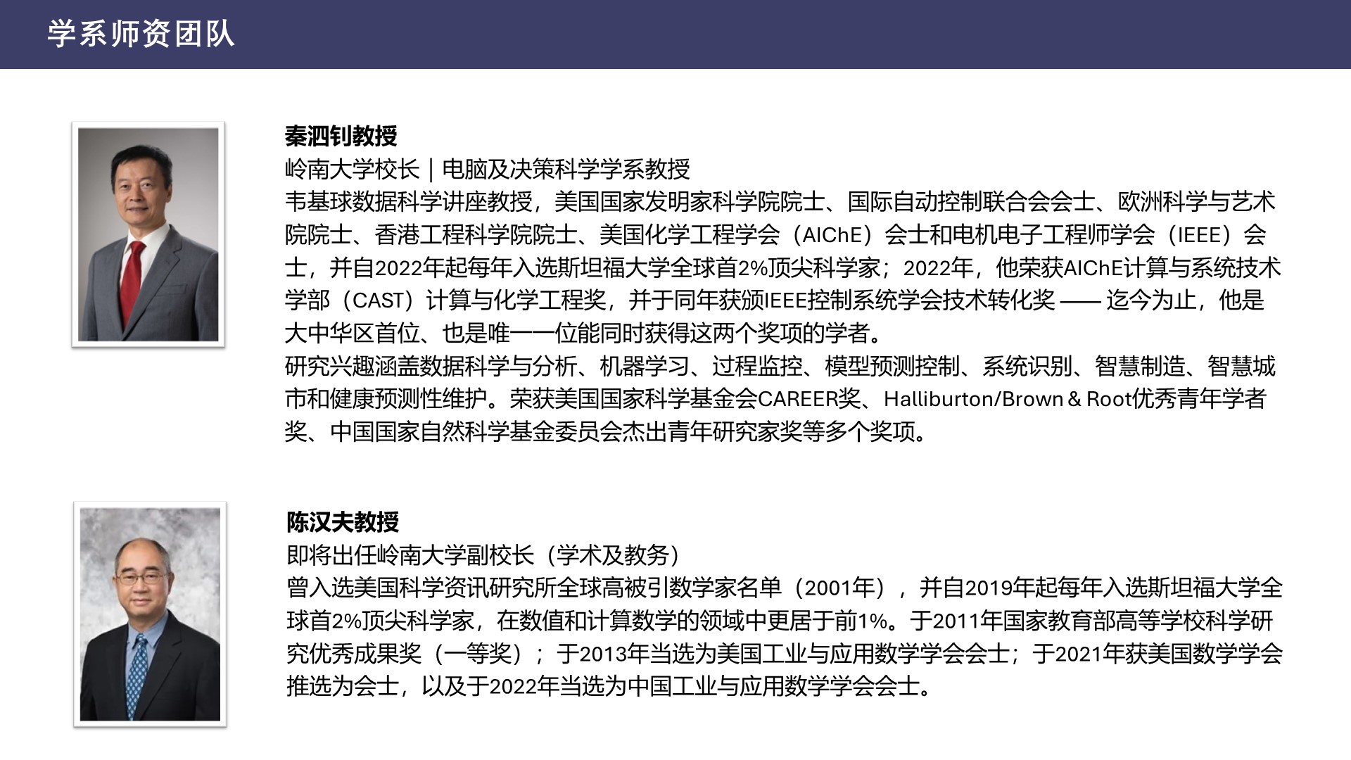 岭南大学的一众专家学者均将深度参与数据科学理学硕士课程的设计与管理,其中包括校长秦泗钊教授、即将出任岭大副校长(学术及教务)的陈汉夫教授、副校长(研究及创新)姚新教授以及协理副校长(策略型研究)邝得互教授。