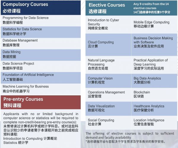 学生需要修读7门必修课程和3门选修课程。未曾修读过计算机科学和统计学科目或对这些科目认识较少的申请者,可在开学前完成相应的预科课程(计算概论和统计学)。