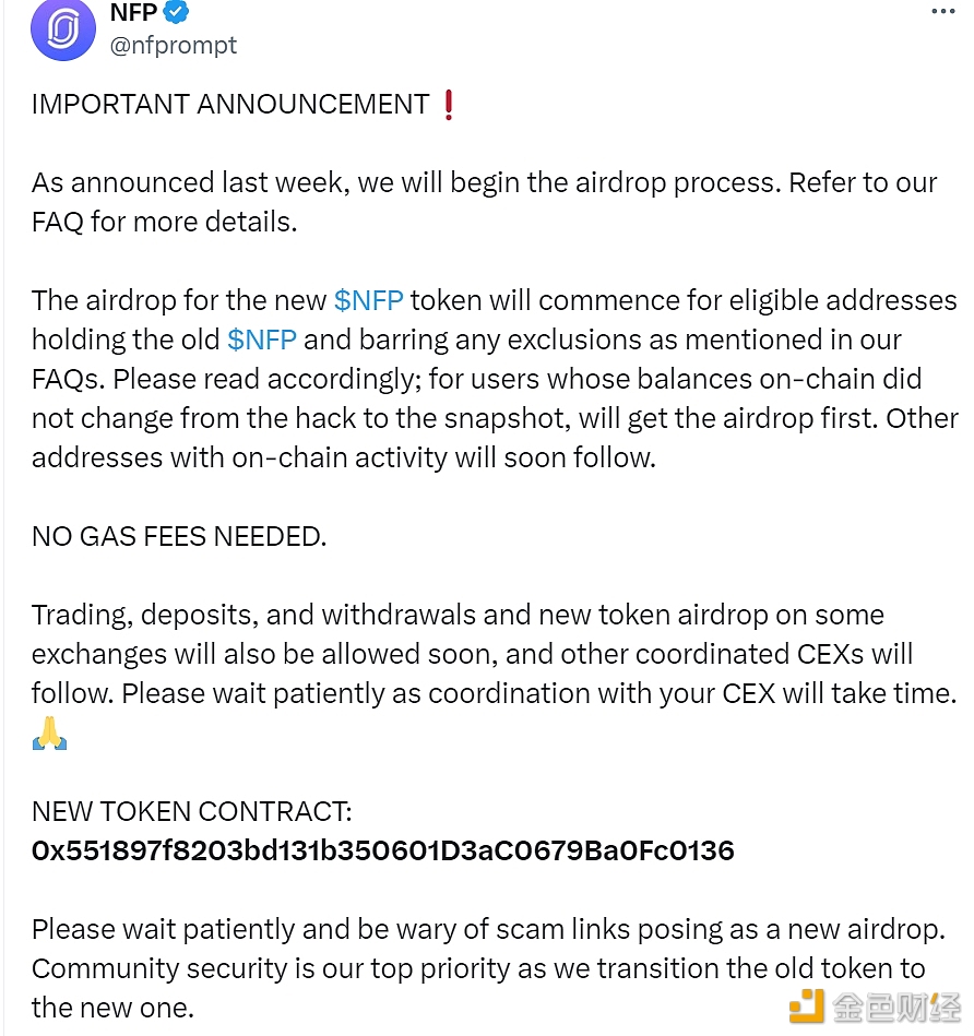 新NFP代币的空投将开始于持有旧NFP的合格地址(除 FAQ 中提到的任何排除情况)。链上余额从黑客攻击时到快照时间没有发生改变的用户将首先获得空投,其他进行链上活动的地址也将很快跟进。领取无需gas费用。