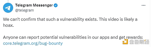 本站报道,针对近期有关自动下载安全漏洞的报道,Telegram在X平台发文回应,我们无法确认是否存在这样的漏洞。该视频很可能是一个骗局。任何人都可以报告我们应用程序中的潜在漏洞并获得奖励。