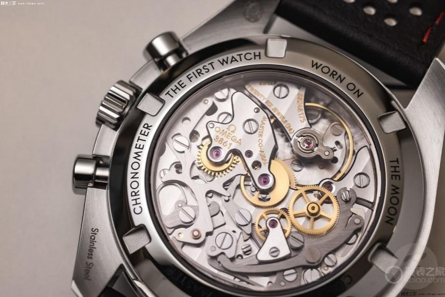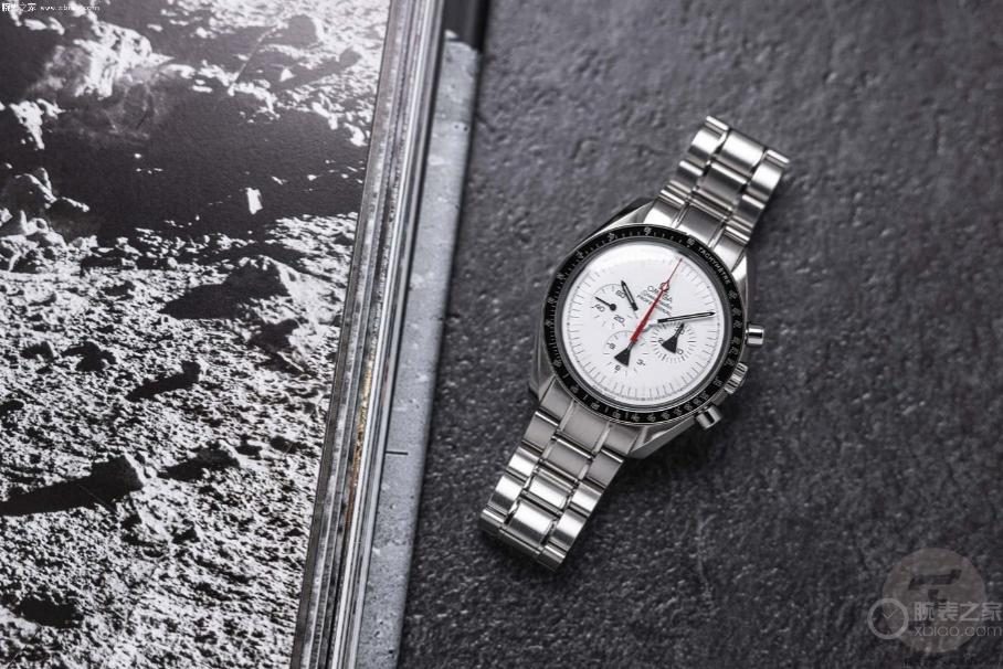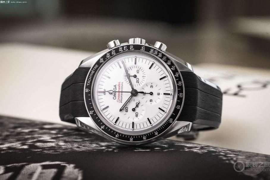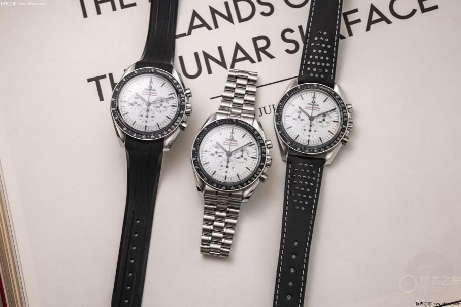 欧米茄超霸系列专业月球表白盘款提供三种不同型号:精钢表链款(型号:310.30.42.50.04.001)、饰以红白双色缝线的黑色微孔皮表带款(型号:310.32.42.50.04.001)、以及橡胶表带款(型号:310.32.42.50.04.002)。橡胶表带和几年前“Moonshine Panda”版的表带完全一致,与表壳完美契合,且表带内侧饰有立体的月球表面图案。皮表带和橡胶表带均搭配折叠扣。