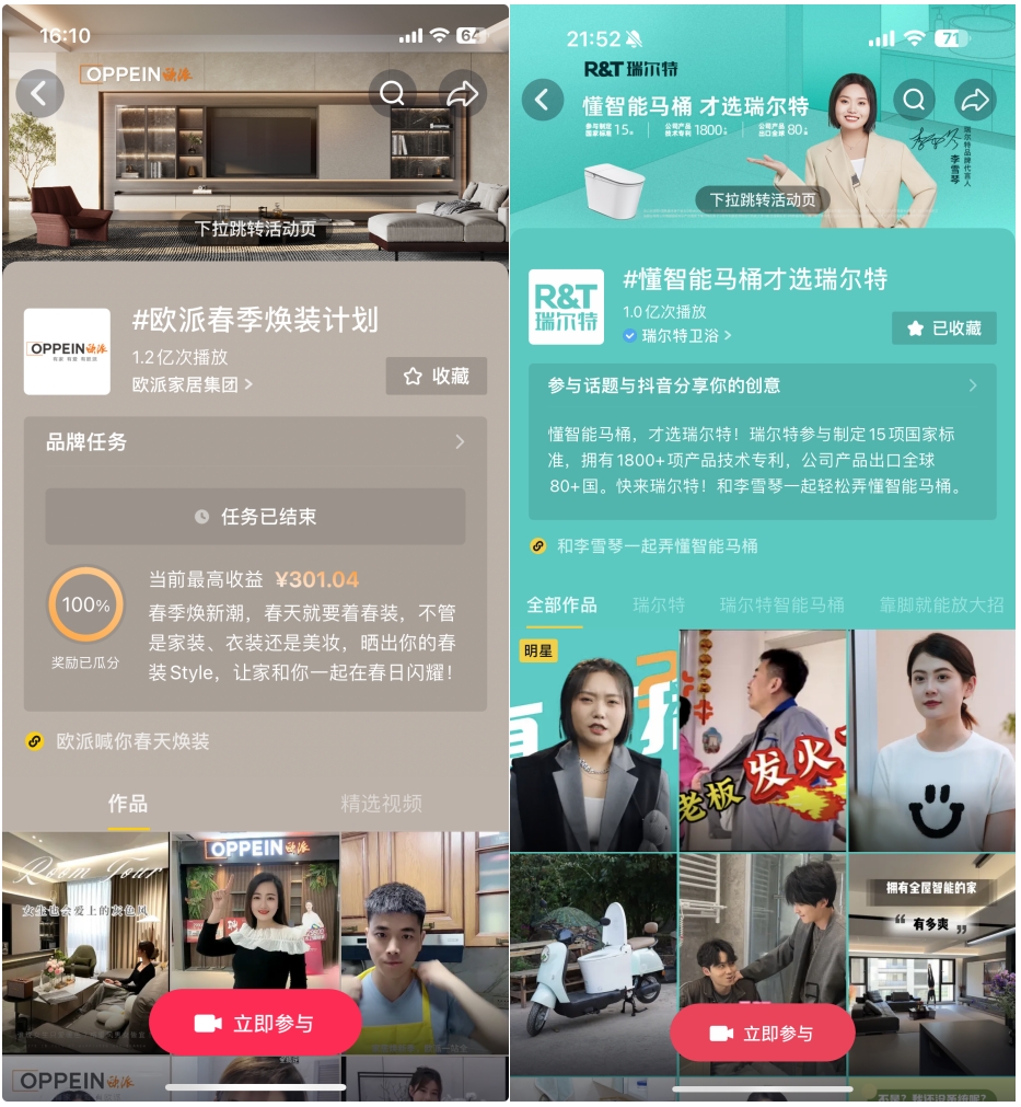 欧派借助明星 达人矩阵的流量势能,携手@陈靖可 、@韩潇 和其他站内达人打造话题声量脉冲,实现品牌和春季家装焕装节点强绑定,最后以大额券强化用户购买心智;而瑞尔特更是借官宣代言人@李雪琴 达人矩阵,一举引爆#懂智能马桶才选瑞尔特 话题,同时官旗配套25周年福利等活动承接用户消费最后一站,打通了从品牌到产品到销售的全链路,单品稳居虹吸式智能马桶爆款榜TOP1。