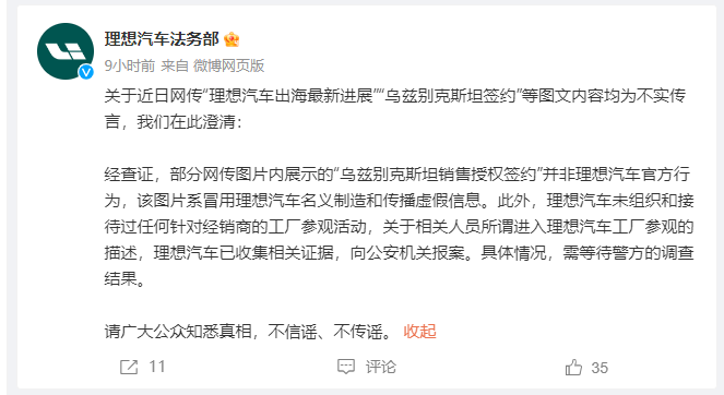 理想汽车法务部微博4月13日消息,近日网传“理想汽车出海最新进展”、“乌兹别克斯坦签约”等图文内容均为不实传言。经查证,部分网传图片内展示的“乌兹别克斯坦销售授权签约”并非理想汽车官方行为,该图片系冒用理想汽车名义制造和传播虚假信息。此外,理想汽车未组织和接待过任何针对经销商的工厂参观活动,关于相关人员所谓进入理想汽车工厂参观的描述,理想汽车已收集相关证据,向公安机关报案。具体情况需等待警方的调查结果。