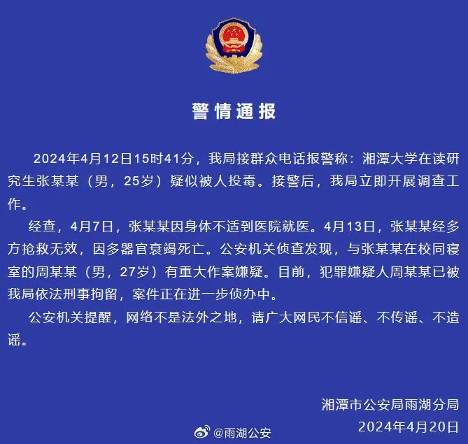 4月20日,湘潭市公安局雨湖分局发布通报:2024年4月12日15时41分,我局接群众电话报警称:湘潭大学在读研究生张某某(男,25岁)疑似被人投毒。接警后,我局立即开展调查工作。