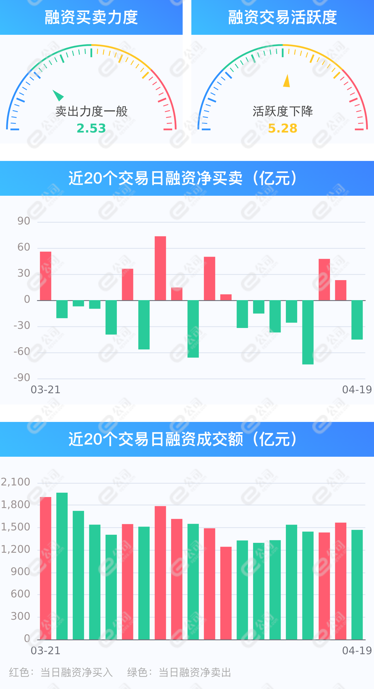 截至4月19日,上交所融资余额报7879.31亿元,较前一交易日减少21.16亿元;深交所融资余额报6992.50亿元,较前一交易日减少24.2亿元;两市合计14871.80亿元,较前一交易日减少45.36亿元,融资交易额1468.70亿元,占A股成交额17.07%,其中融资买入额711.67亿元,融资偿还额757.03亿元,交易活跃度下降6.22%。