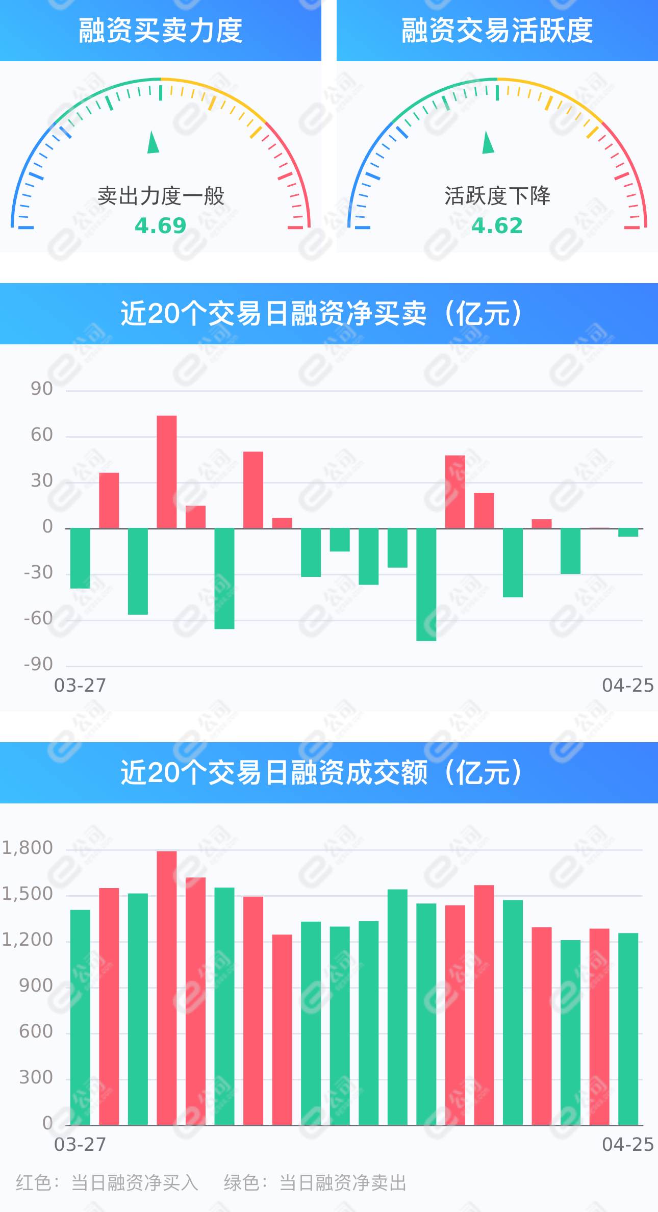 截至4月25日,上交所融资余额报7845.59亿元,较前一交易日减少7.63亿元;深交所融资余额报6996.34亿元,较前一交易日增加1.98亿元;两市合计14841.93亿元,较前一交易日减少5.65亿元,融资交易额1252.78亿元,占A股成交额16.18%,其中融资买入额623.57亿元,融资偿还额629.22亿元,交易活跃度下降2.25%。