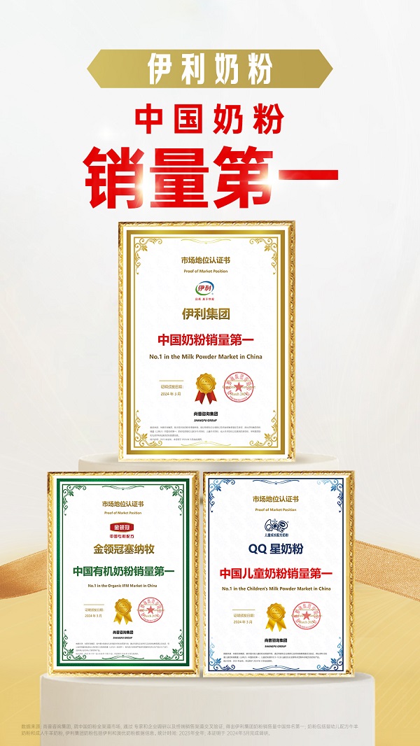 同时,权威调研机构尚普咨询也向伊利集团颁发多项“第一”认证证书,奶粉相关的有:2023年度伊利集团奶粉在中国大陆奶粉全渠道市场全年销量排名第一;伊利金领冠塞纳牧斩获中国大陆婴幼儿有机配方奶粉全渠道市场销量第一[1];伊利QQ星儿童奶粉成为“中国儿童奶粉销量第一”。