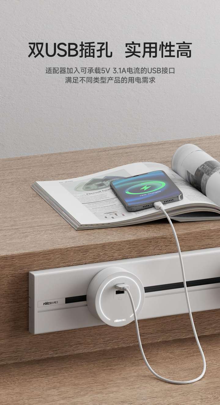 令人惊喜的是,NVC雷士电工这款轨道插座搭载了适配器加入可承载5V 3.1A电流的双USB插孔,可满足不同类型的产品的用电需求,使得用电更加灵活便捷,实用性非常高,为人们学习、娱乐、生活带来便利,无论是卧室还是客厅,都能找到它的一席之地,备受家年轻家装群体的欢迎。