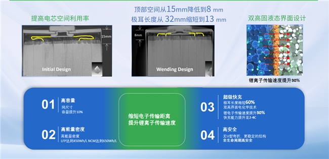 研发成果方面,瑞浦兰钧最广为人知的应该是2022年8月推出的问顶电池技术。该技术缩短了电池极耳长度,采用一体化焊接技术,使电芯内部结构实现了一体化的连接,电池原有的顶部空间由15mm缩减到了8mm,内部空间利用率有效提升7%以上,实现了450Wh/L的体积能量密度,可应用于磷酸铁锂、三元锂电池产品。