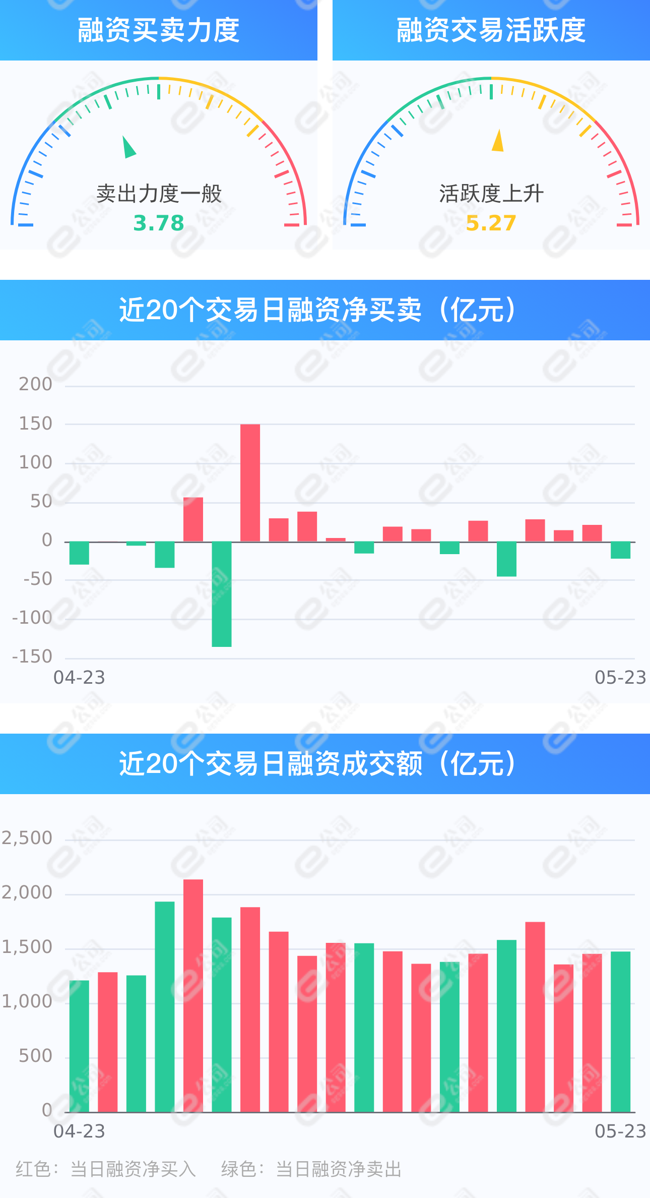 截至5月23日,上交所融资余额报7921.60亿元,较前一交易日减少9.88亿元;深交所融资余额报7053.91亿元,较前一交易日减少12.5亿元;两市合计14975.51亿元,较前一交易日减少22.38亿元。统计发现,融资客中止连续3日净买入。