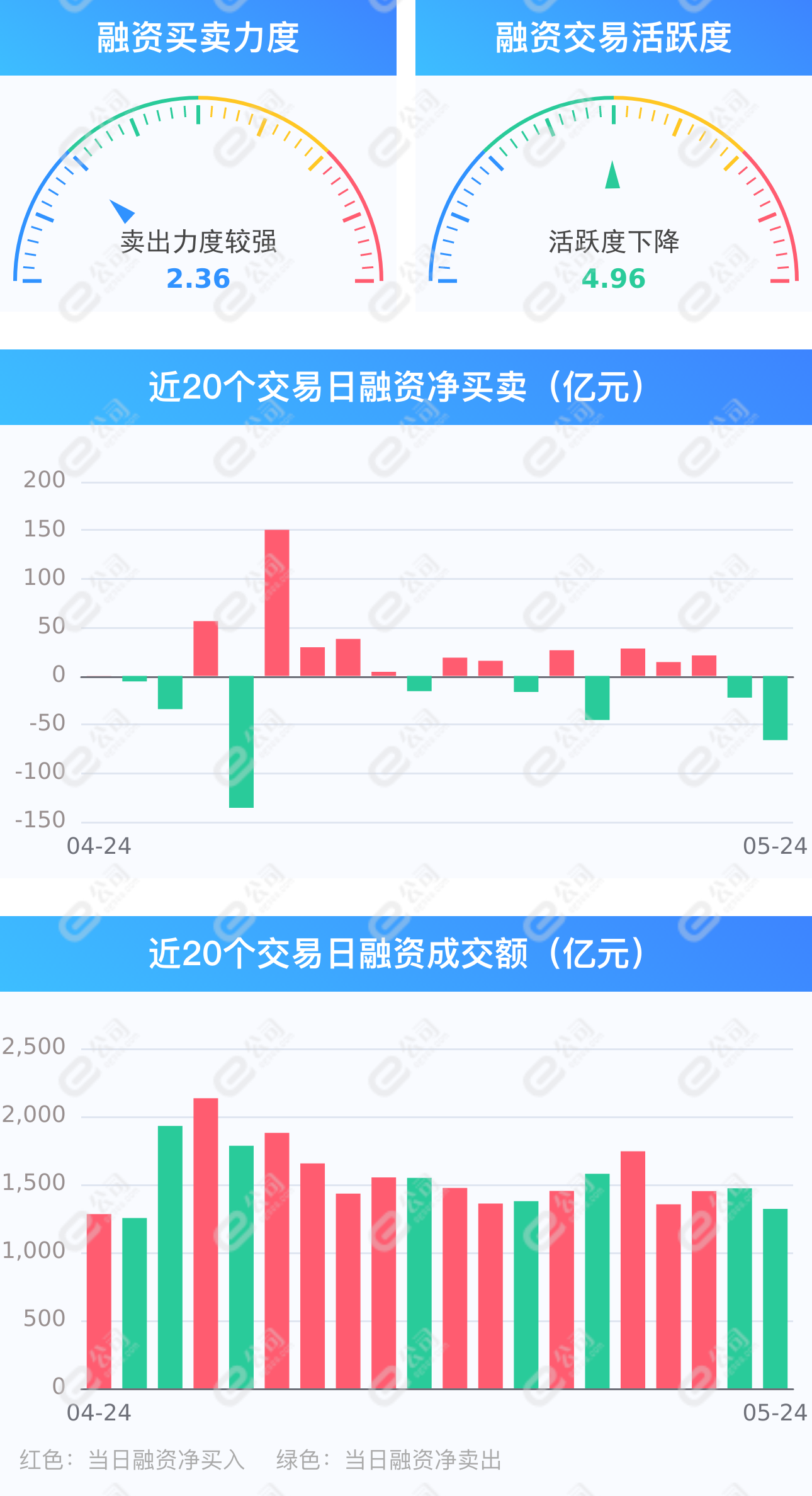 截至5月24日,上交所融资余额报7890.57亿元,较前一交易日减少31.04亿元;深交所融资余额报7018.91亿元,较前一交易日减少34.99亿元;两市合计14909.48亿元,较前一交易日减少66.03亿元,融资交易额1319.95亿元,占A股成交额17.28%,其中融资买入额626.96亿元,融资偿还额692.99亿元,交易活跃度下降10.24%。(此稿由证券时报e公司写稿机器人“快手小e”完成。)
