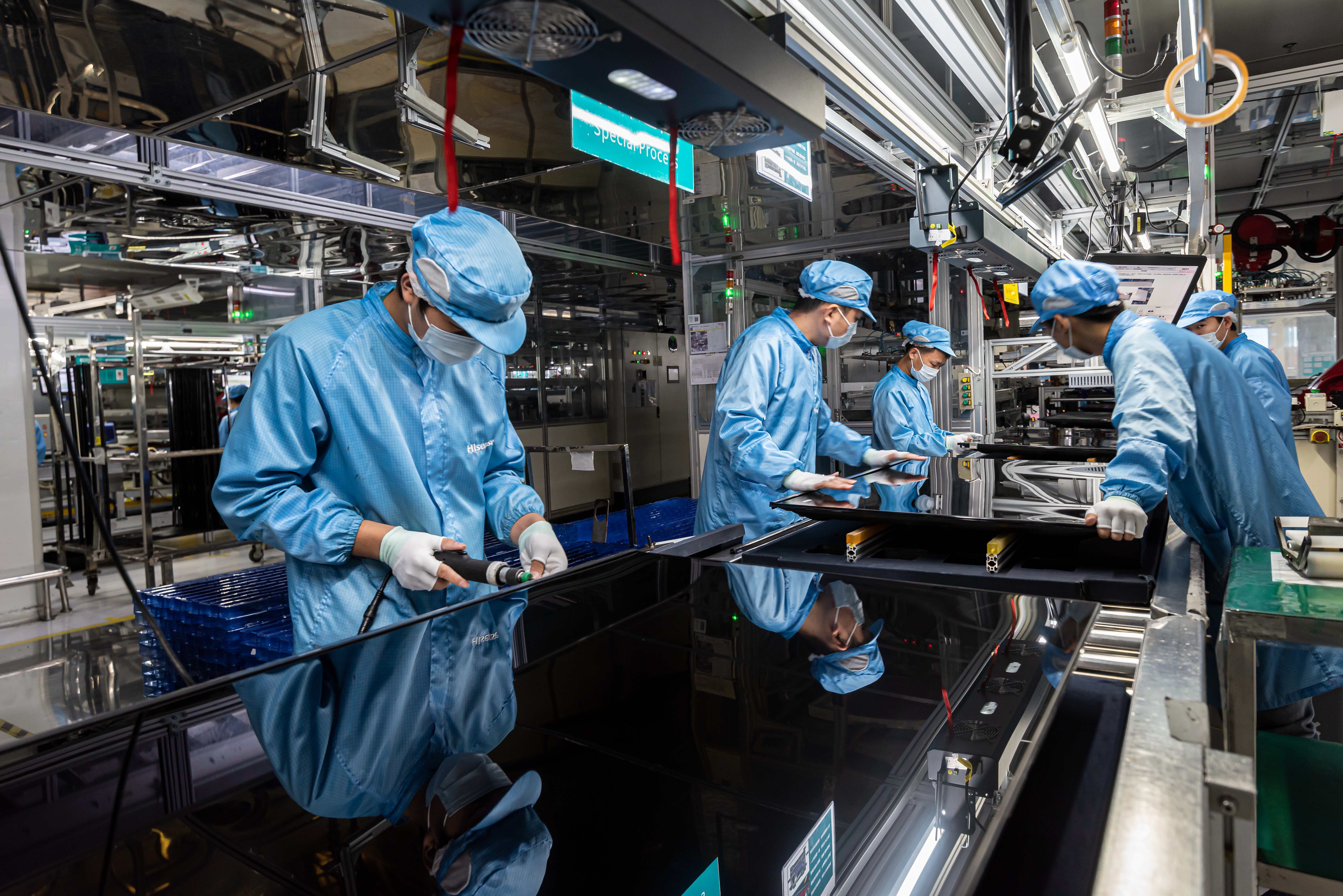 客户正在欣海公司的工厂查验PC瓦板。受访者供图