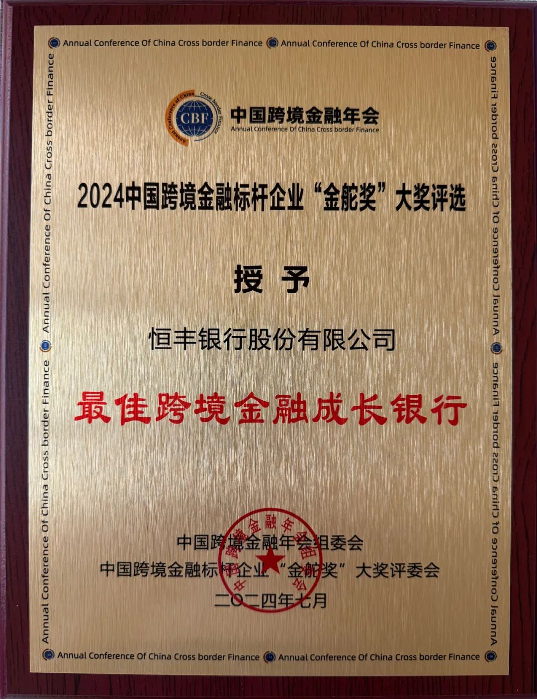 近日,2024中国跨境金融年会暨中国跨境金融标杆企业大奖“金舵奖”颁奖典礼在京举行。恒丰银行凭借优秀的跨境金融创新成果与跨境金融服务水平,荣获“最佳跨境金融成长银行”奖项。
