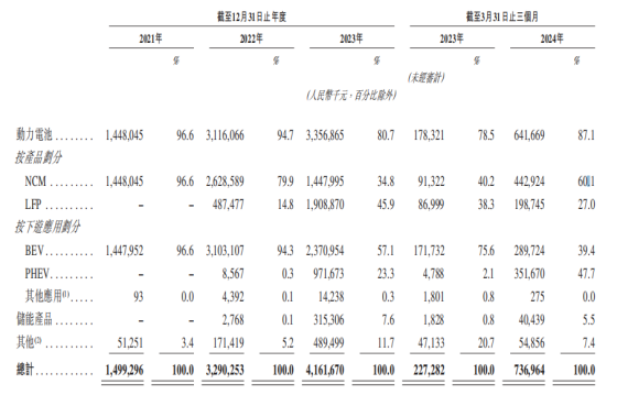 需要指出的是,BEV电池产品在收入中的贡献持续下滑,今年一季度已降至39.4%;而PHEV电池产品在收入中的占比持续增长,达47.7%。