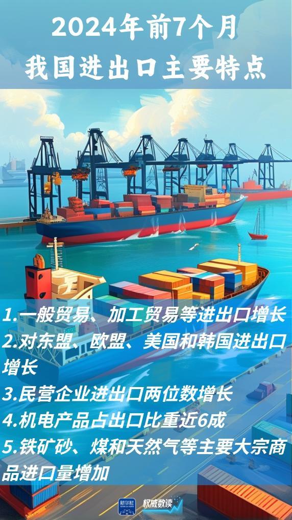 具体来看,出口实现稳定增长。前7个月,我国出口14.26万亿元,同比增长6.7%。进口规模稳中有增。前7个月,我国进口10.57万亿元,同比增长5.4%。