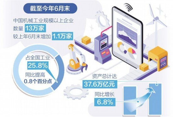 产业规模继续扩大。截至今年6月末,中国机械工业规模以上企业数量13万家,较上年6月末增加1.1万家,占全国工业的25.8%,占比较上年同期提高0.8个百分点;资产总计达37.6万亿元,同比增长6.8%。