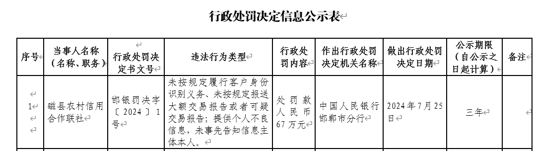 磁县农信联社被罚67万:因未按规定履行客户身份识别义务等 更新时间:2024-08-09 16:22:11 •阅读 0 财经8月9日讯 近日,中国人民银行邯郸市分行行政处罚决定信息公示表显示,磁县农村信用合作联社因未按规定履行客户身份识别义务、未按规定报送大额交易报告或者可疑交易报告;提供个人不良信息,未事先告知信息主体本人,被处罚款67万元;作出行政处罚决定日期为2024年7月25日。