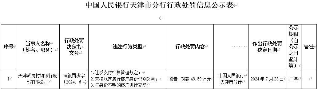 天津武清村镇银行被罚49.59万:因违反支付结算管理规定等 更新时间:2024-08-09 16:22:14 •阅读 0 财经8月9日讯 近日,中国人民银行天津市分行行政处罚信息公示表显示,天津武清村镇银行因违反支付结算管理规定;未按规定履行客户身份识别义务;与身份不明的客户进行交易,被警告并处罚款49.59万元;作出行政处罚决定日期为2024年7月23日。