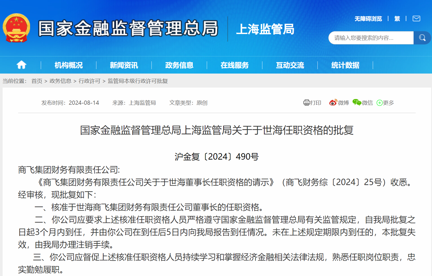 于世海获批出任商飞集团财务公司董事长 更新时间:2024-08-15 11:22:32 •阅读 0 财经8月15日讯 昨日,国家金融监督管理总局上海监管局公布相关批复表示,核准于世海商飞集团财务有限责任公司(简称:商飞集团财务公司董事长的任职资格。以下是相关批复正文: