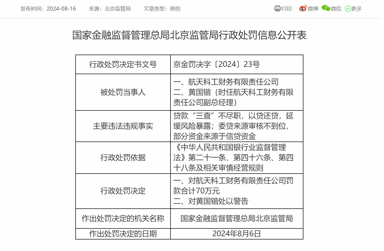 航天科工财务公司被罚70万元:因贷款“三查”不尽职等
