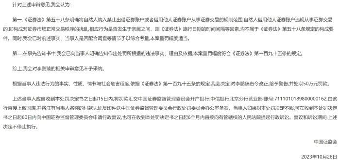 在2023年证监会公布的一份行政处罚决定书中,当事人李鹏臻违规借用亲属账户炒股,被顶格处罚50万元。当时,证监会即指出,《证券法》第五十八条明确将自然人纳入禁止出借证券账户或者借用他人证券账户从事证券交易的规制范围,自然人借用他人证券账户违规从事证券交易的,即构成对证券市场正常交易秩序的扰乱,相应行为是否发生于亲属之间、距《证券法》施行日期的时间间隔等因素,均不属于《证券法》第五十八条规定的构成要件。