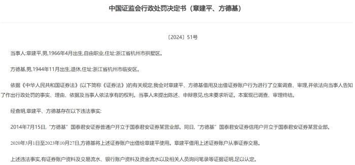 证监会此前披露的一则行政处罚决定书显示,章建平和方德基被证监会处以50万元的顶格罚款。