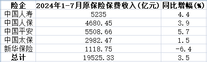 A股五大上市保险公司2024年1月至7月保费收入(指原保险保费,下同数据显示,中国人寿、中国人保、中国平安、中国太保和新华保险前7个月合计揽入保费19525.33亿元,同比增长3.5%。