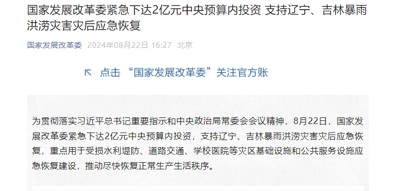 财经8月22日讯 据国家发展改革委微信公众号消息,为贯彻落实习近平总书记重要指示和中央政治局常委会会议精神,8月22日,国家发展改革委紧急下达2亿元中央预算内投资,支持辽宁、吉林暴雨洪涝灾害灾后应急恢复,重点用于受损水利堤防、道路交通、学校医院等灾区基础设施和公共服务设施应急恢复建设,推动尽快恢复正常生产生活秩序。